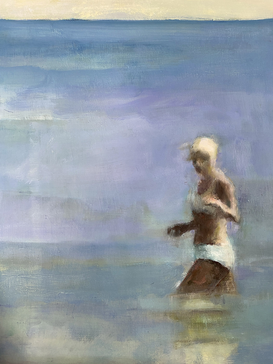 ‘Based in East London, I am an artist who likes to capture ordinary fleeting moments. This can be through observing people in their everyday lives around the city or using retrospective images. Throughout their lives, both my grandfather and father took many photographs and shot cine film, so from 1930 onwards there is a vast catalogue of visual stimulus which I have drawn upon whilst creating many of my paintings. As I start to compose and paint these images, they often take on dreamlike qualities reflecting the transient nature of these moments.’